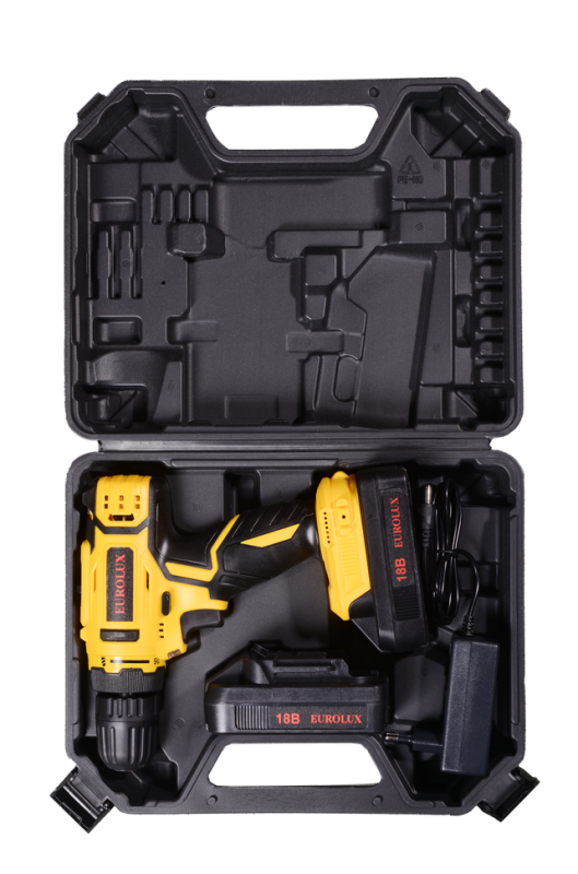 Комплект поставки включает в себя шуруповерт Eurolux ДА-18/2Li, зарядное устройство и два аккумулятора.