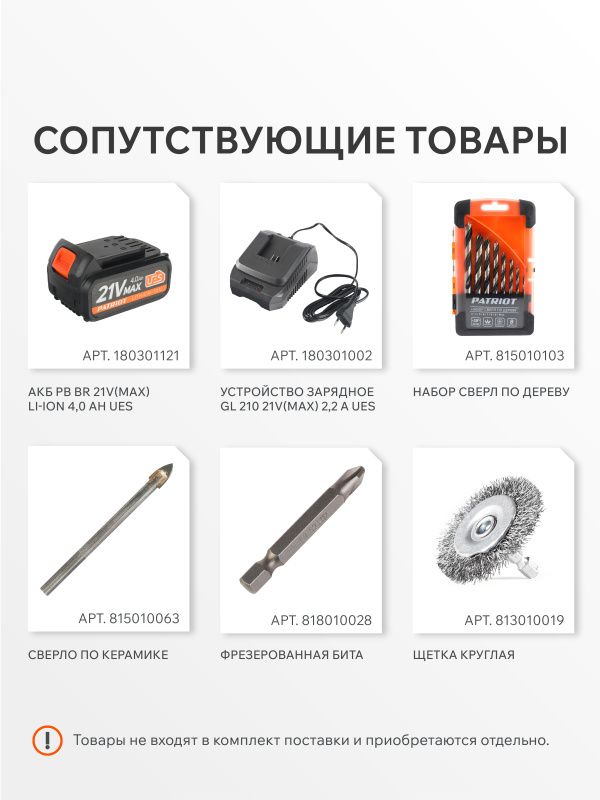| Комплектация* | Дрель-шуруповерт аккумуляторная; Аккумуляторная батарея: 2 шт.; Зарядное устройство; Инструкция |