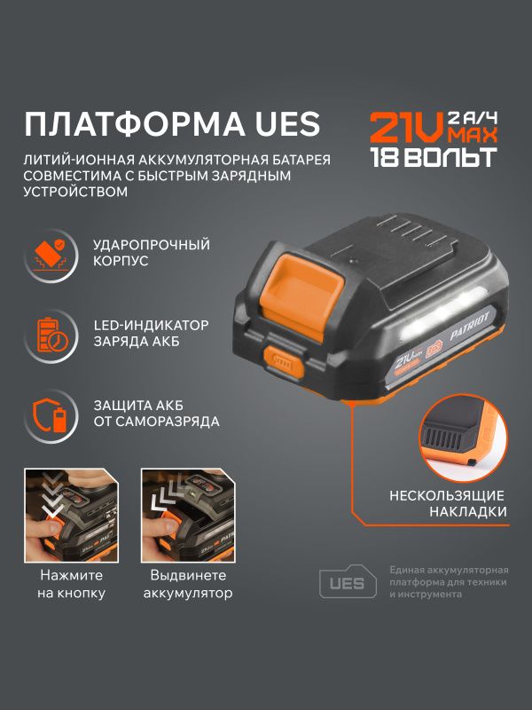 | Дополнительные характеристики | • Бесщёточный двигатель • Крутящий момент 85Нм • Режим удара • Подсветка рабочей зоны • Аккумуляторная платформа UES |