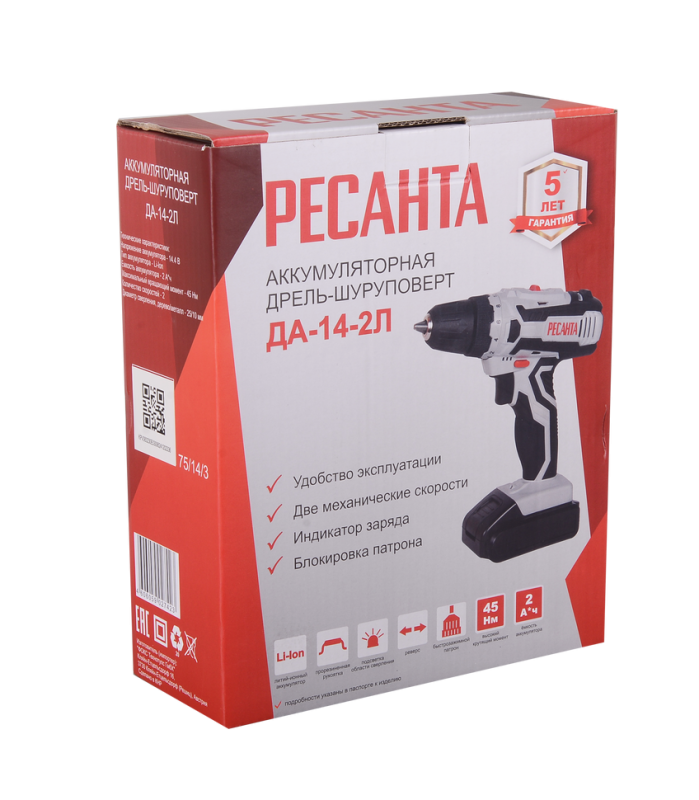 Дрель-шуруповерт аккумуляторная Ресанта ДА-14-2Л, 75/14/3