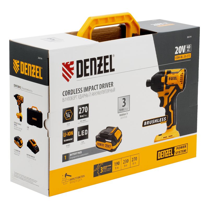 Бесщеточный аккумуляторный ударный винтоверт Denzel CIDH-BL-20-270, Li-Ion, 20 В, 26514