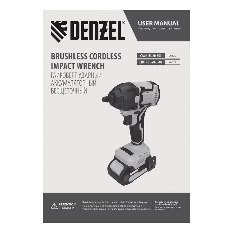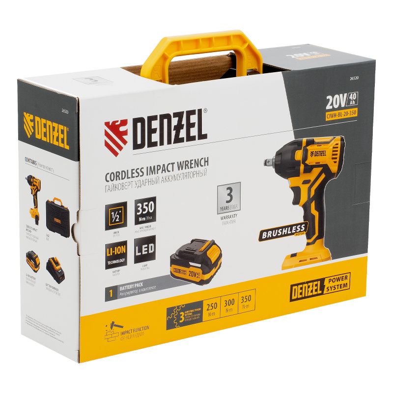 Гайковёрт ударный аккумуляторный Denzel CIWH-BL-20-350, бесщёточный, 26520: надёжный помощник для любых задач