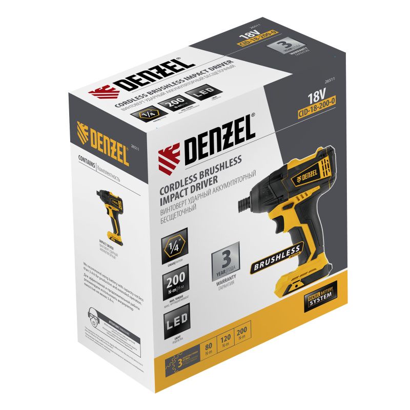 Винтоверт ударный аккумуляторный бесщет Denzel CID-IB-200-0, 26511