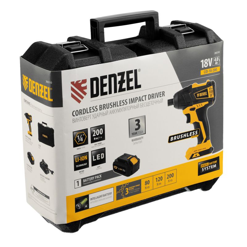 Винтоверт ударный аккумуляторный бесщет Denzel CID-IB-200, 26510