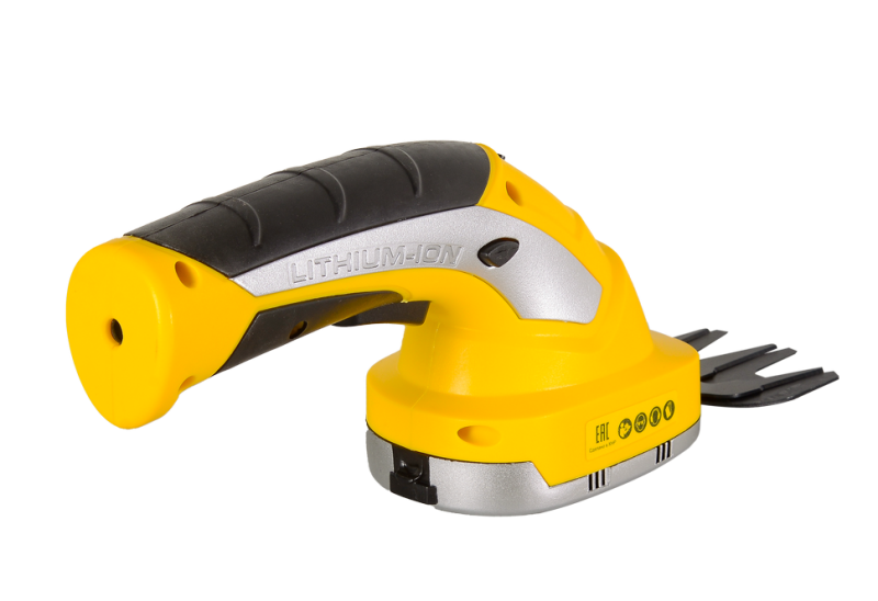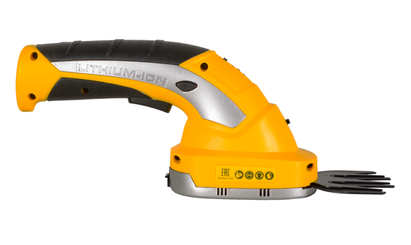 Корпус аккумуляторного кустореза выполнен в виде овальной платформы с наклонной эргономичной ручкой. Платформа снабжена крышкой с фиксатором, под которую прочно крепится необходимое для работы лезвие. Рукоятка с резиновыми накладками исключает проскальзывание руки во время работы. Триммер-кусторез обладает небольшим весом - всего 1 кг.