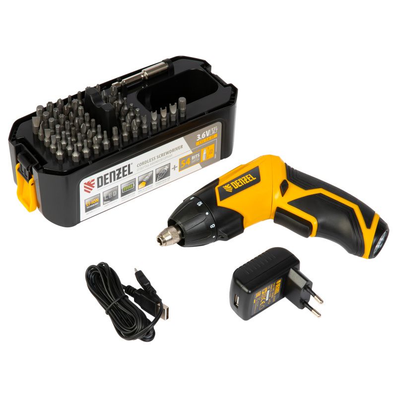Аккумуляторная отвертка DENZEL CSL-3,6-01 с аккумулятором и аксессуарами, 26001