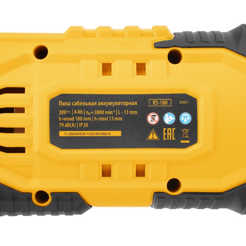 Пила сабельная аккумуляторная Denzel RS-180, 28801