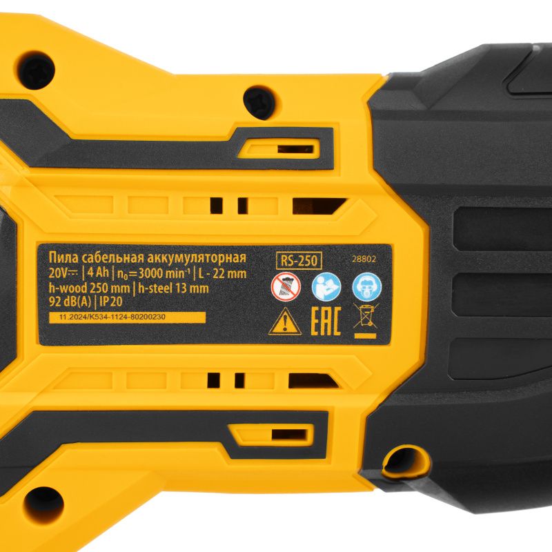 Пила сабельная аккумуляторная Denzel RS-250 бесщеточная, 28802