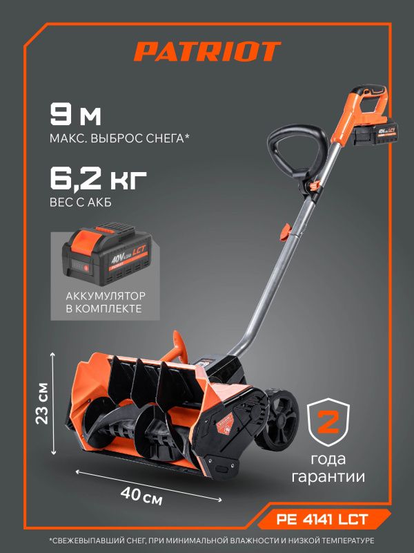 | Дополнительные характеристики | Снегоуборщик аккумуляторный ручной PATRIOT PE 4141 LCT 40V 1АКБ 4Ah + З\У в комплекте |