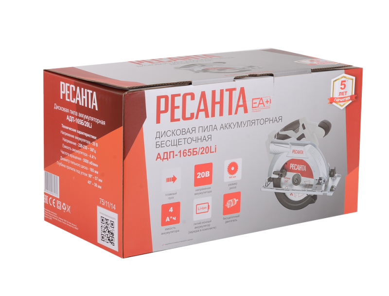 Аккумуляторная дисковая пила АДП-165Б/20Li Ресанта, 75/11/14