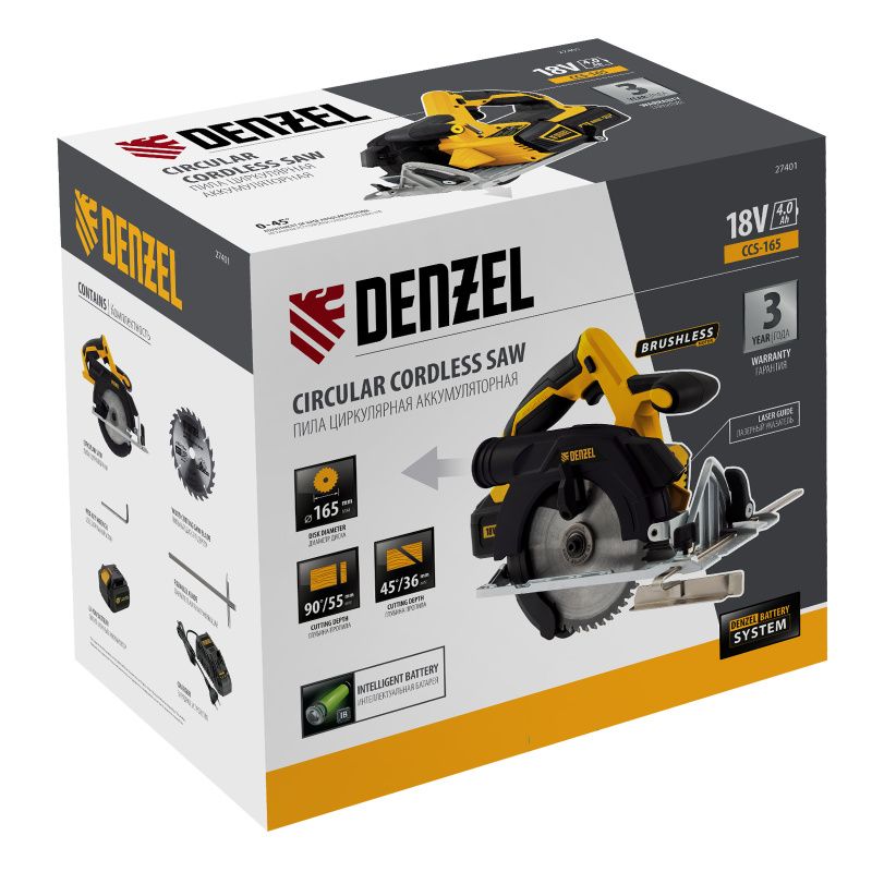 Пила циркулярная аккумуляторная бесщет. Denzel CCS-165, 27401