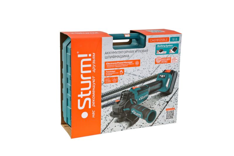 CAG18125BLE УШМ аккумуляторная б/щ Sturm, 18В, 1BatterySystem, 125мм, плавн пуск, 1х4Ач,кейс, CAG18125BLE