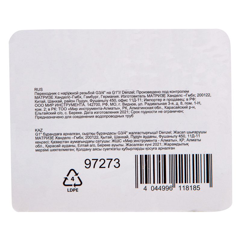 Переходник с наружной резьбой G3/4"-G1" Denzel, 97273