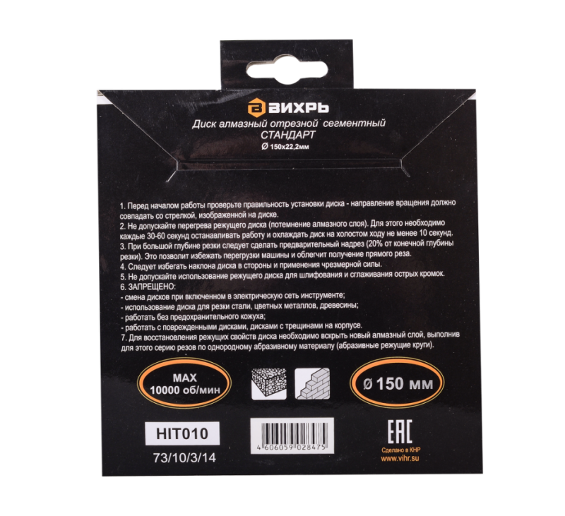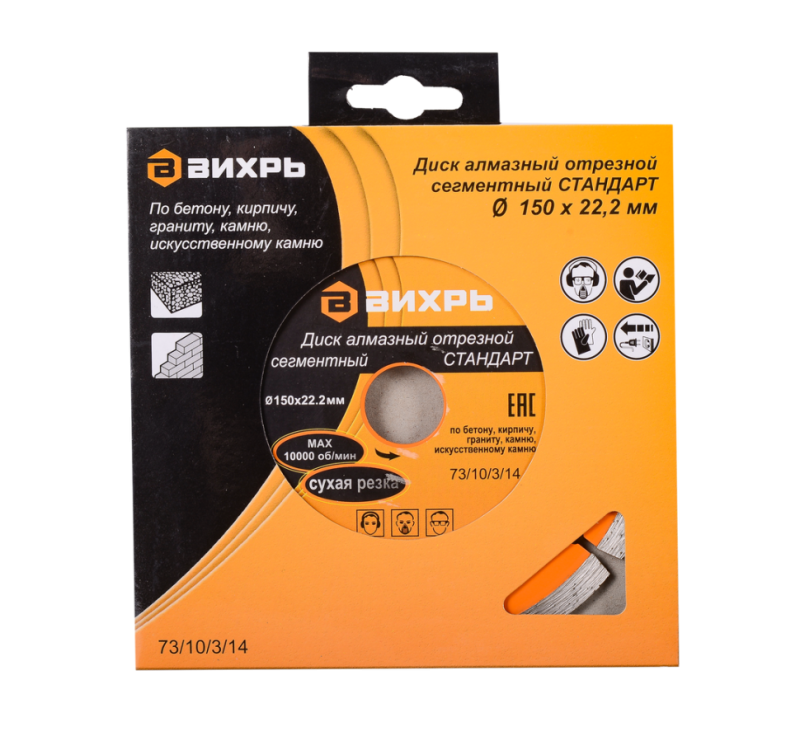 Диск алмазный отрезной сегментный СТАНДАРТ, 150 х 22,2 мм, сухая резка Вихрь, 73/10/3/14
