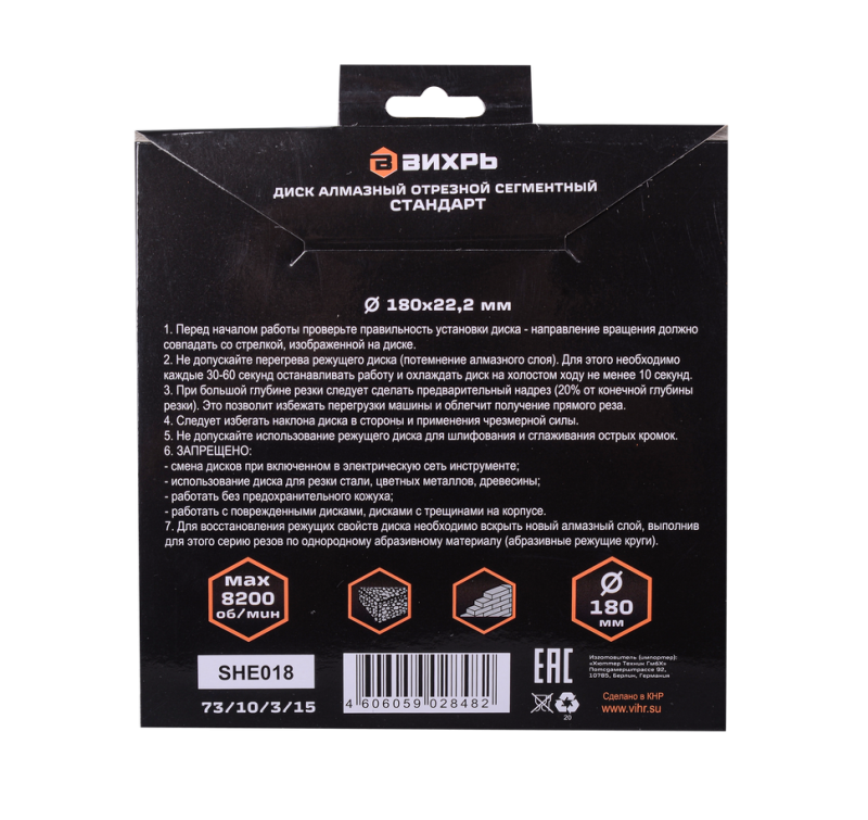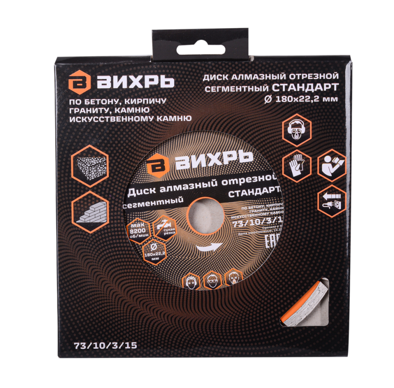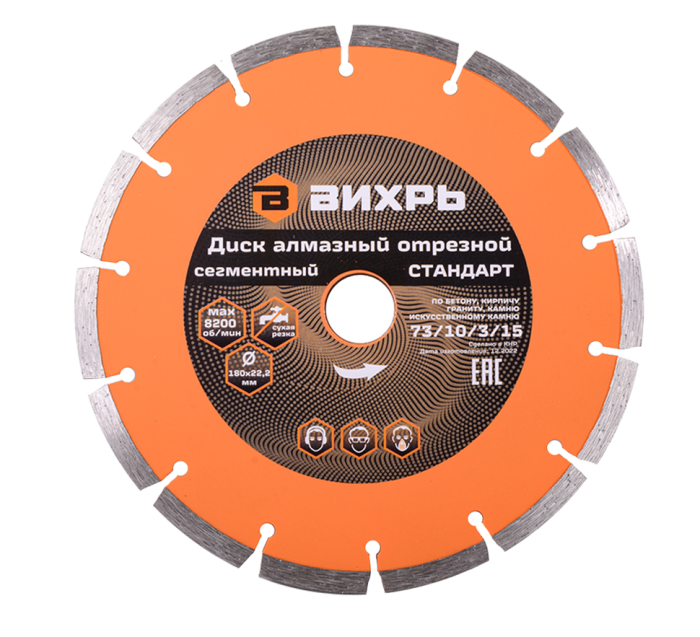 Диск алмазный отрезной сегментный СТАНДАРТ, 180 х 22,2 мм, сухая резка Вихрь, 73/10/3/15