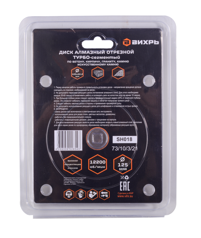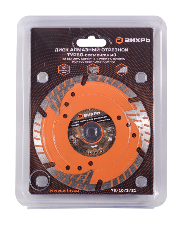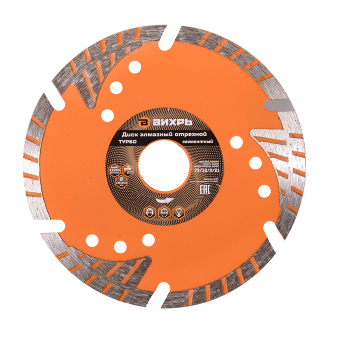 Диск алмазный отрезной Турбо - сегментный, 125 х 22,2 мм, сухая резка Вихрь - это алмазный отрезной диск, который используется совместно с угловыми шлифмашинами (болгарками) для сухой резки гранитных, бетонных, кирпичных и каменных изделий.Особенности: