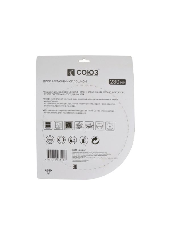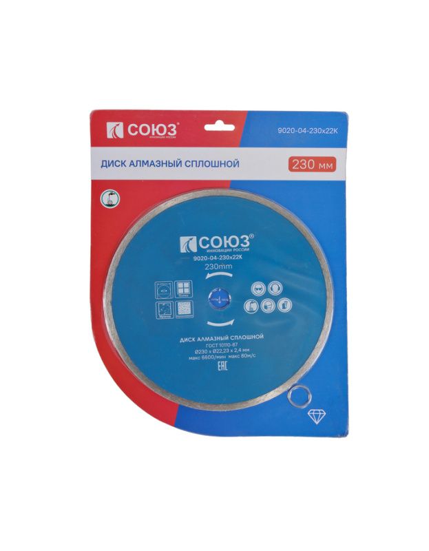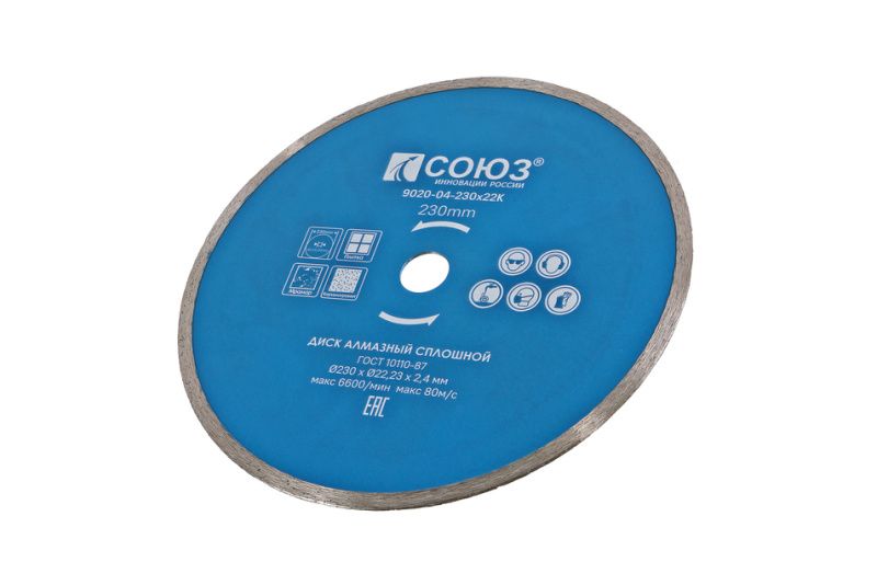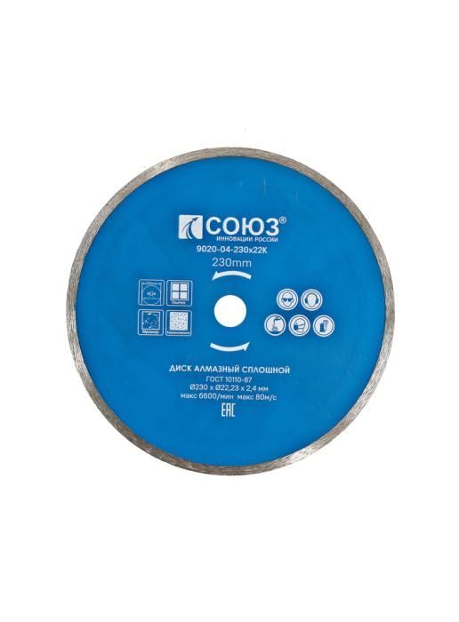 Алмазный диск со сплошным алмазным слоем, 230х22,2, Союз, 9020-04-230x22K