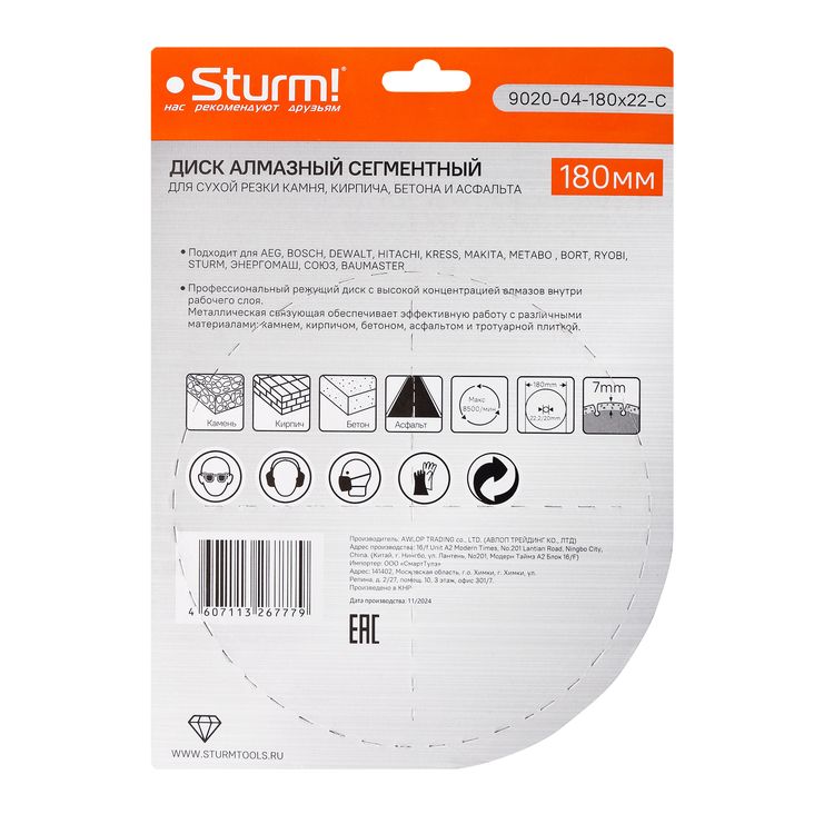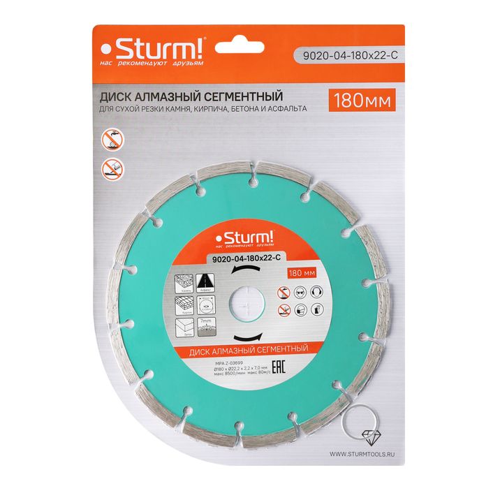 Алмазный диск, сухая резка, сегментный 180мм Sturm, 9020-04-180x22-C
