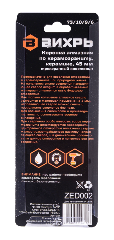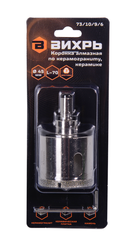 Коронка алмазная Вихрь по керамограниту/керамике, 45 мм, 73/10/9/6