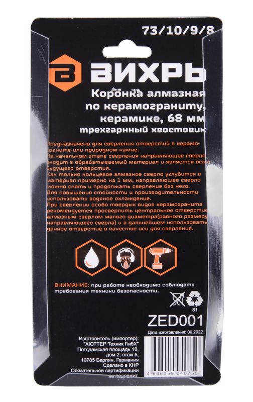 Коронка алмазная Вихрь по керамограниту/керамике, 68 мм, 73/10/9/8