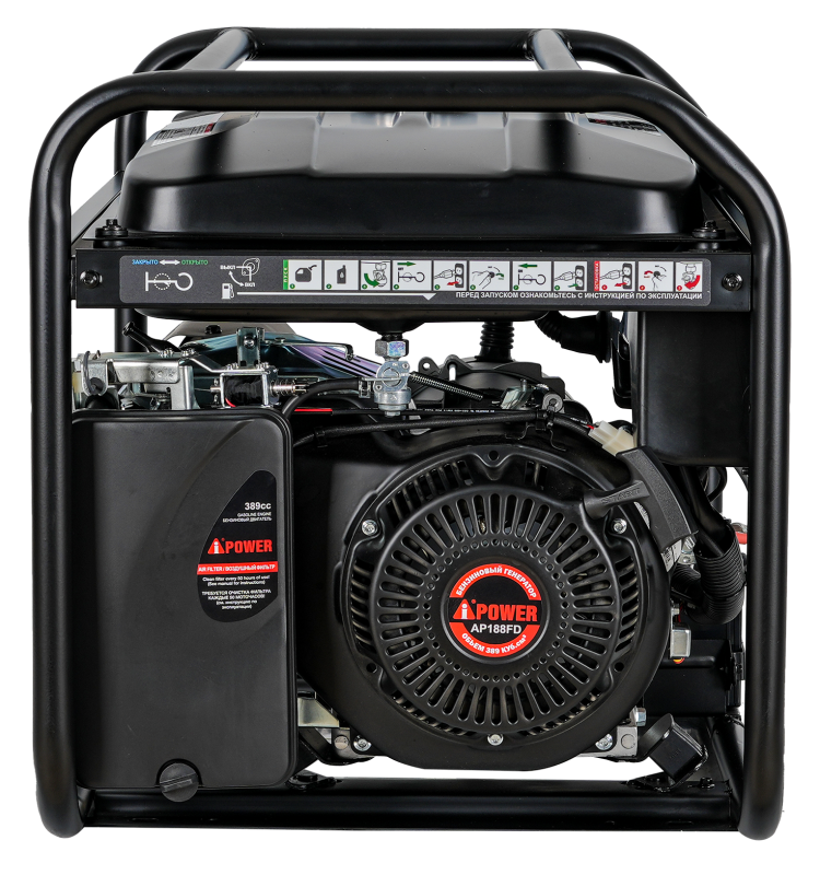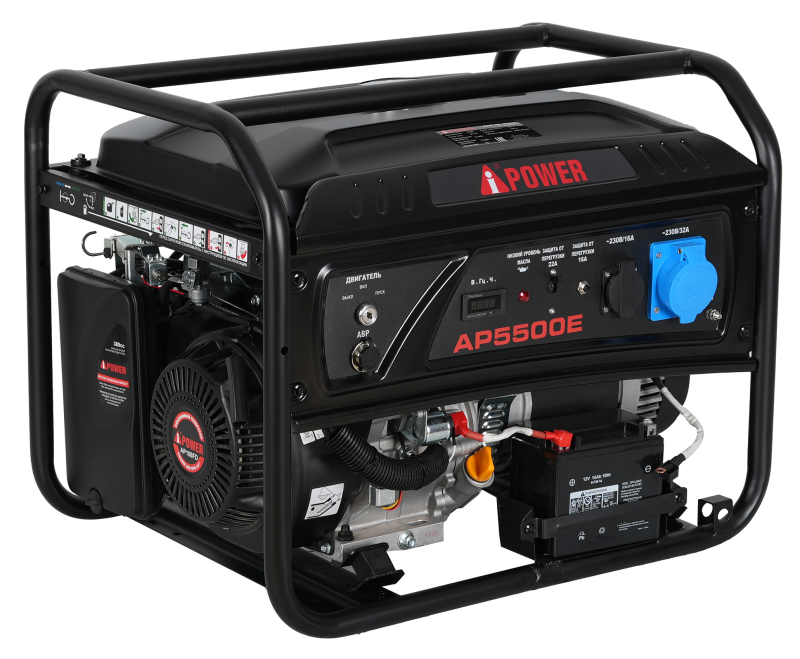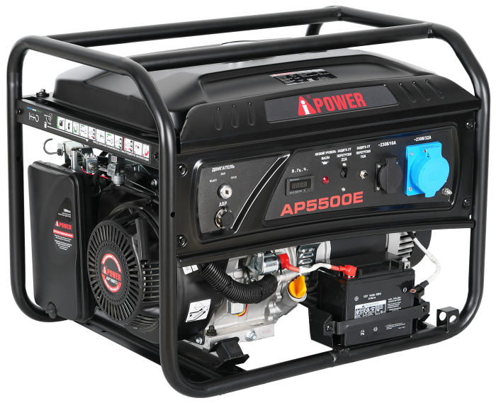 A-iPower AP5500E оснащен компактным гильзованным 4-тактным OHV-двигателем объемом 389 куб. см с электростартером. На панели управления находится одна стандартная розетка 230В/16А и одна силовая розетка 230В/32А. Все розетки закрыты пластиковыми крышками