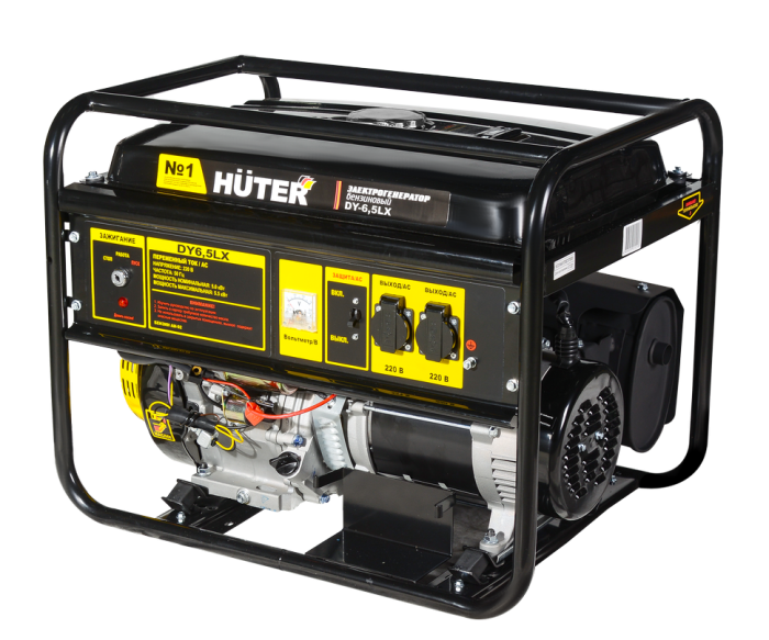 Бензиновый генератор Huter DY6,5LX – портативная компактная электростанция, обеспечивающая электроснабжение бытовой техники и профессионального оборудования, питающегося от стандартной сети 220 Вольт. Это самый выгодный бензиновый электрогенератор, с оптимальными техническими характеристиками и низким расходом топлива.Модель DY6,5LX может использоваться в качестве резервного источника питания для частных домов и квартир, а также как постоянная станция, обеспечивающая работу электроприборов в полевых условиях. Генерирующая установка имеет синхронный тип устройства и щёточный механизм.Комплектация:Бензиновый электрогенератор.Силовая вилка 32 АСвечной ключ. Вороток либо отвёртка (в зависимости от модели)Провода и детали лотка аккумуляторной батареи (для моделей с X в названии)Комплект резиновых опор с гайкамиКлюч электростартера (для моделей с обозначением X)Паспорт (руководство по эксплуатации)Бензиновая электростанция Huter DY6,5LX оборудована мощным одноцилиндровым четырёхтактным двигателем внутреннего сгорания, мощностью 13 л.с. Запуск производится ручным стартером или электростартером от АКБ (*аккумулятор не входит в комплектацию и приобретается отдельно). Для удобства транспортировки, отдельно можно приобрести колёса и ручки. Электрогенератор DY6,5LX имеет рабочую мощность 5 кВт, а также все виды защиты – от перегрузки, короткого замыкания и низкого масляного уровня.