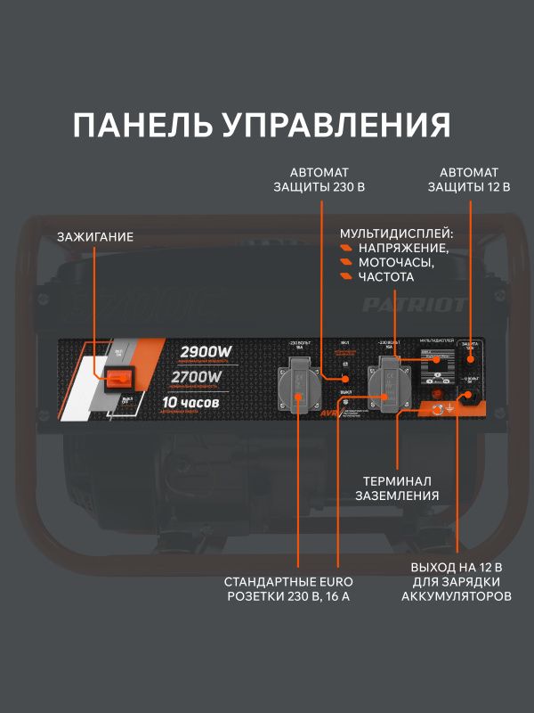 Генератор Patriot GRS 3700C оснащен удобной утопленной панелью управления, которая исключает механические повреждения генератора. Это особенно удобно в случае экстренной ситуации или при работе на строительной площадке, где генератор может находиться в недоступном месте.