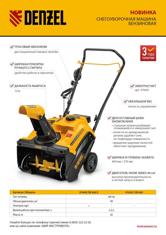 Приобретая бензиновый снегоуборщик Denzel SB 460, вы получаете надежный и мощный инструмент, который поможет вам быстро и легко очистить площади от снега. Не откладывайте зимние задачи на потом - с Denzel вы справитесь с ними легко и быстро!