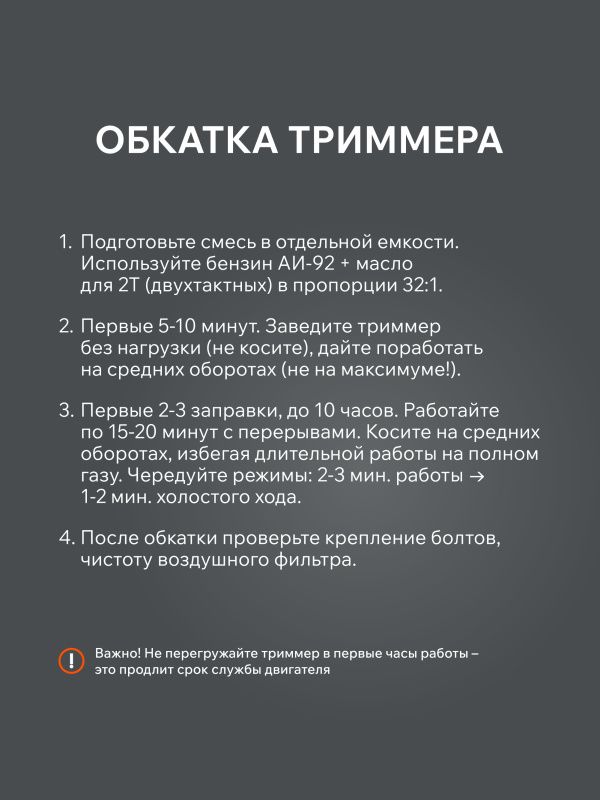 Запуск двигателя проводится посредством ручного стартера. Управлять триммером достаточно просто — необходимые навыки можно обрести уже после первого использования инструмента.
