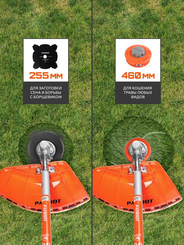Мощный бензиновый двигатель позволяет работать с аппаратом в течение длительного времени. За счет использования жидкого топлива -бензина, инструмент не имеет привязки к сети, поэтому его можно применять вдали от источников питания. Корпус и режущий элемент изготовлены из прочных материалов, поэтому триммер можно применять при необходимости скоса плотной травы.