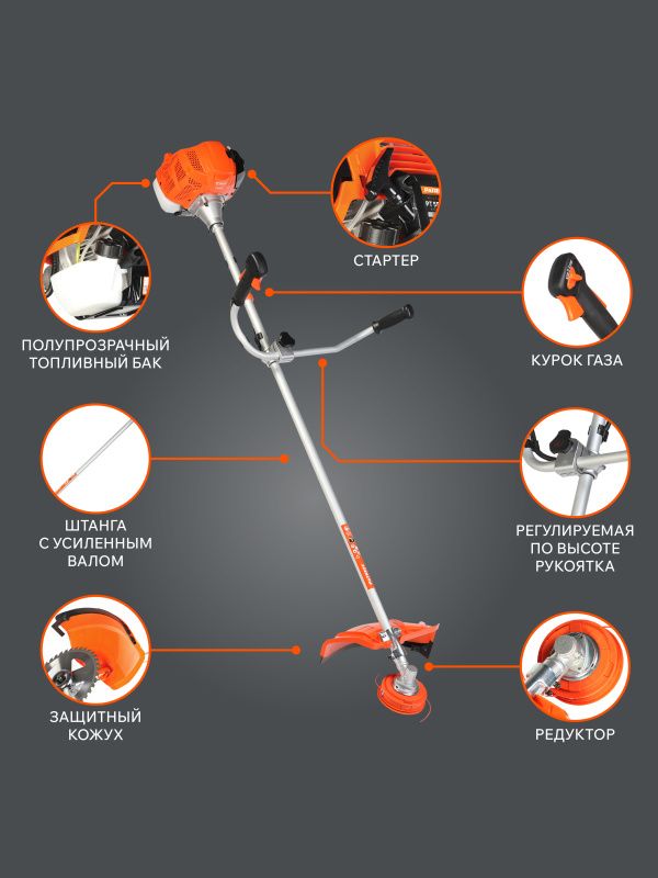 | Комплектация* | Двигатель в сборе с рукояткой; Трансмиссионный узел в сборе; Рукоятка; Защитный кожух с крепежной планкой; Набор ключей для сборки и обслуживания (опционально); Набор креплений для сборки; Комплект для установки триммерного ножа; Емкость для приготовления топливной смеси; Триммерная катушка; Ножи 40Т и 3Т; Ранцевый ремень; Инструкция |