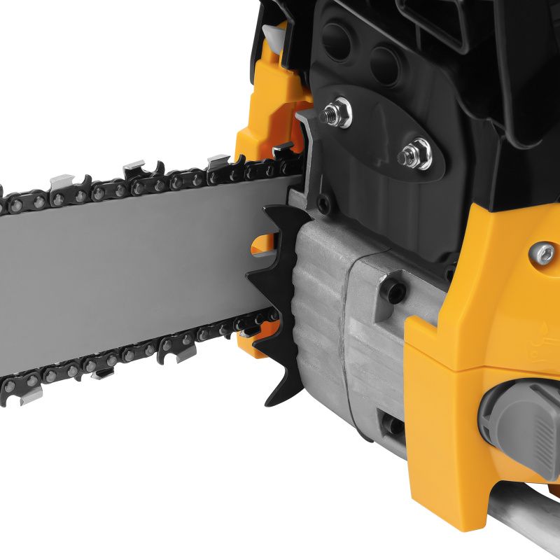 Бензиновый двигатель. Независимость от электросети делает пилу удобной в использовании на больших расстояниях или в местах без доступа к электричеству.