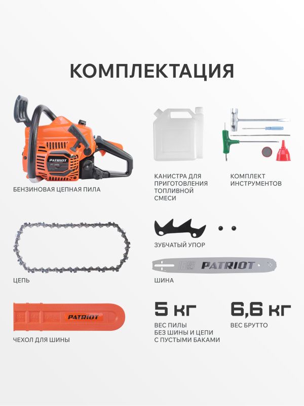 | Комплектация* | Пила цепная бензиновая; Шина; Кожух шины; Цепь; Упор с комплетом крепежа; Набор ключей (опционально); Емкость для приготовления топливной смеси; Инструкция по эксплуатации; |