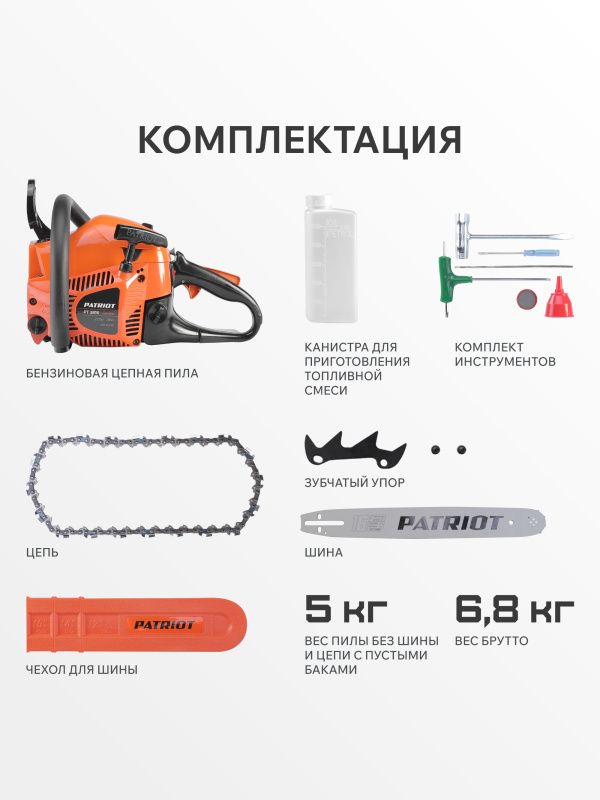 | Комплектация* | Пила цепная бензиновая; Шина; Кожух шины; Цепь; Упор с комплетом крепежа; Набор ключей (опционально); Емкость для приготовления топливной смеси; Инструкция по эксплуатации; |