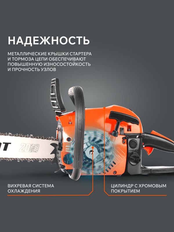 Пила оснащена боковым натяжителем цепи, системой остановки двигателя при случайном падении и праймером подкачки бензина. Также, в пилу вмонтирована система гашения вибрации, которая значительно увеличивает ресурс работы инструмента и сохраняет руки оператора от усталости. Цилиндр покрыт слоем цинка, который защищает его от коррозии.