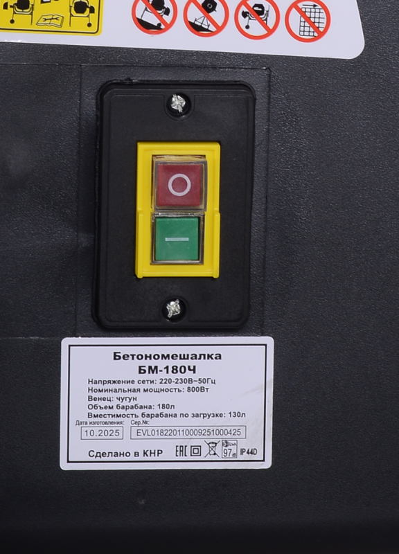 | Комплектация* | Паспорт изделия, Крепежный комплект, Колесо поворотное, Опора передняя, Опора задняя, Нижняя часть барабана, Кронштейн, Верхняя часть барабана, Корпус с электродвигателем, Рама разборная, Диск-фиксатор угла наклона, Колесо транспортировочное 2 шт., Лопасти 2 шт., Резиновая прокладка, Траверса, Шток и педаль |