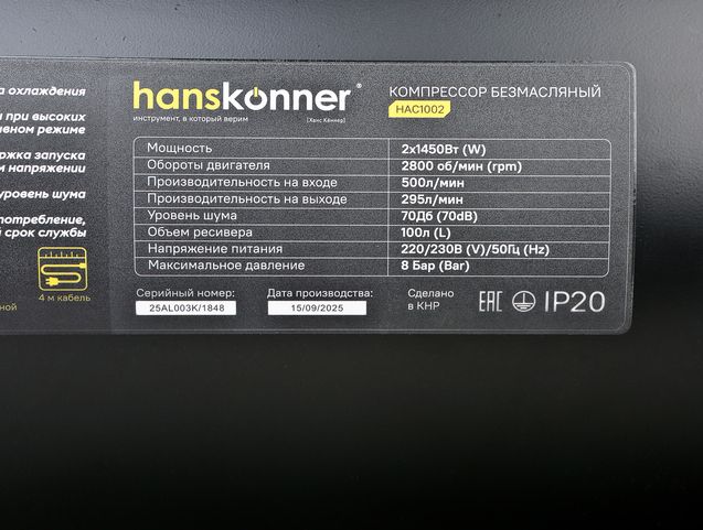HAC1002 Компрессор воздушный безмасляный Hanskonner, HAC1002