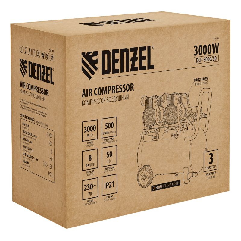 Малошумный безмасляный компрессор Denzel DLP-3000/50, 58144 — надёжное решение для вашей мастерской
