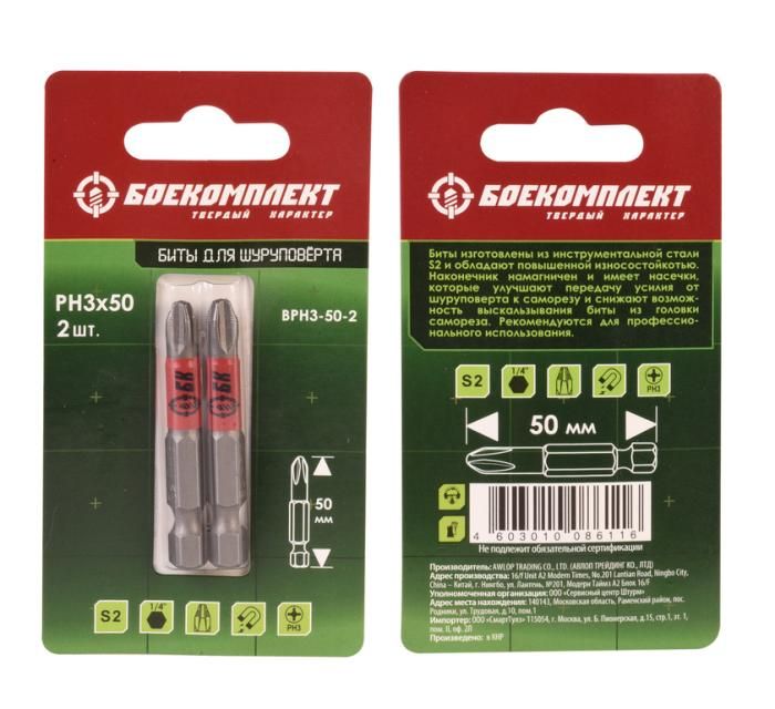 Биты PH3x50мм, сталь S2, 2шт, БОЕКОМПЛЕКТ, BPH3-50-2