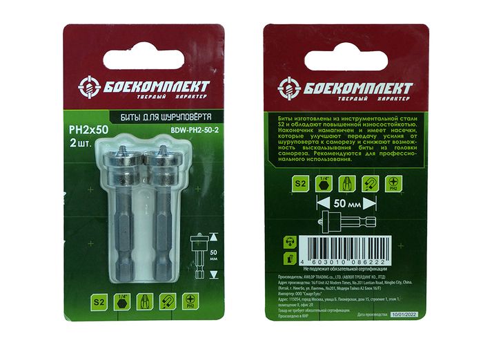 Биты по гипсокартону PH2x50мм, сталь S2, 2шт, БОЕКОМПЛЕКТ, BDW-PH2-50-2