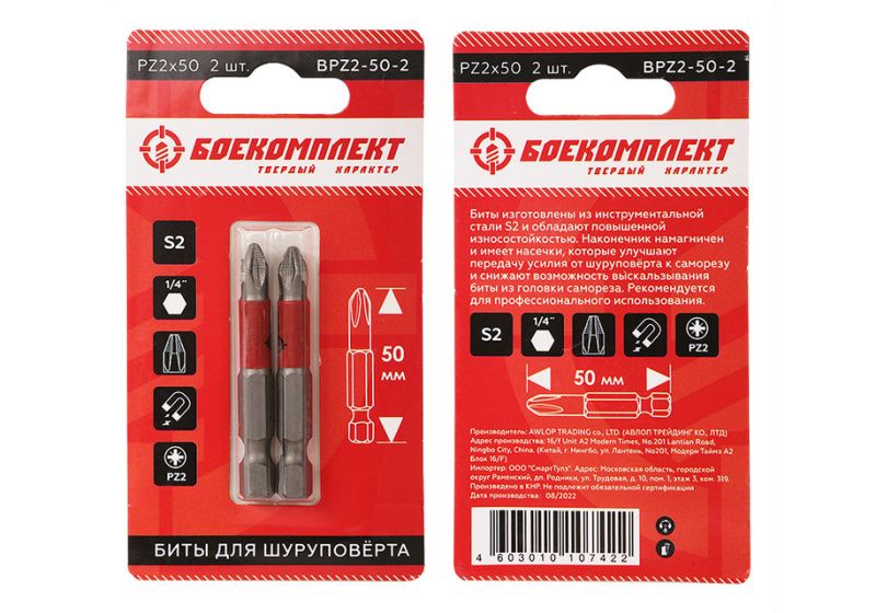 Биты PZ2x50мм, сталь S2, 2шт, БОЕКОМПЛЕКТ, BPZ2-50-2