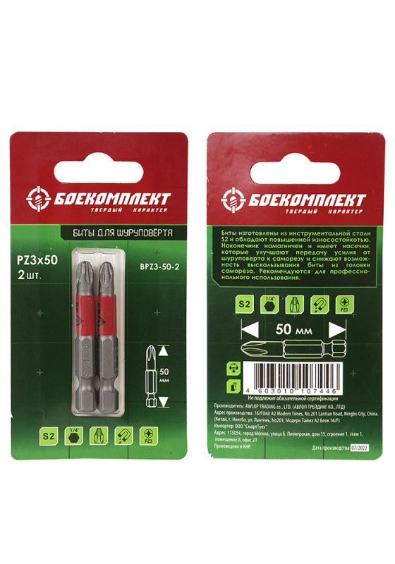 Биты PZ3x50мм, сталь S2, 2шт, БОЕКОМПЛЕКТ, BPZ3-50-2