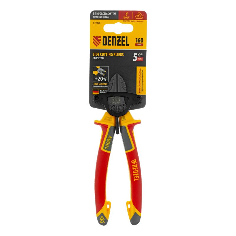 Бокорезы, диэлектрические рукоятки, до 1000 В, трехкомпонентные рукоятки, 160 мм Denzel, 17788