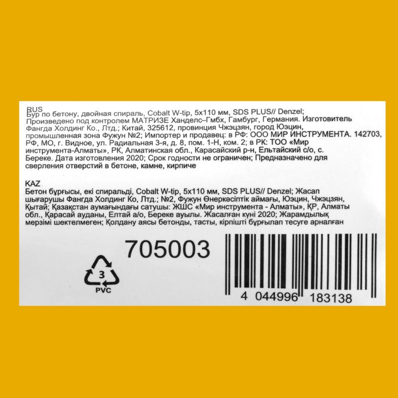 Бур по бетону DENZEL 5 x 110 мм, 705003