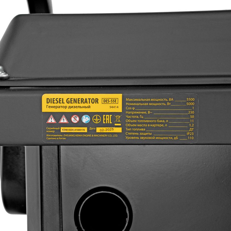 Какой объём топливного бака у генератора Denzel DES-55E? Топливный бак генератора имеет объём 11 литров, что обеспечивает длительную работу без дозаправки.