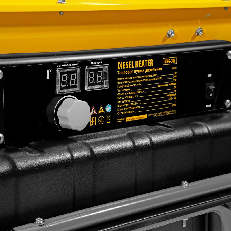 Управление пушкой Denzel NHG-30i производится с помощью панели управления, что позволяет удобно и легко регулировать температуру и мощность нагрева. Компактные размеры и колеса для перемещения делают эту пушку мобильной и удобной в использовании.