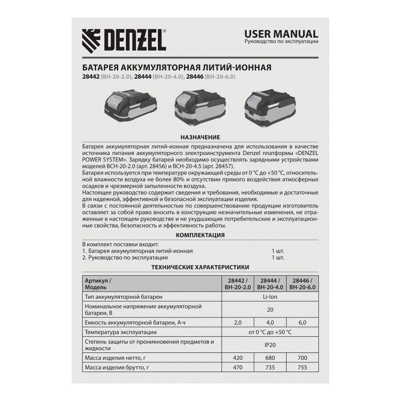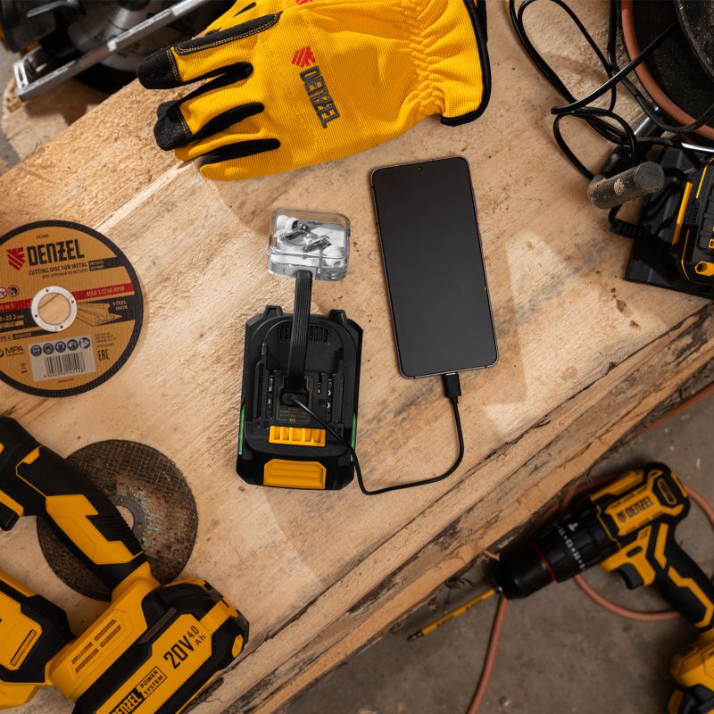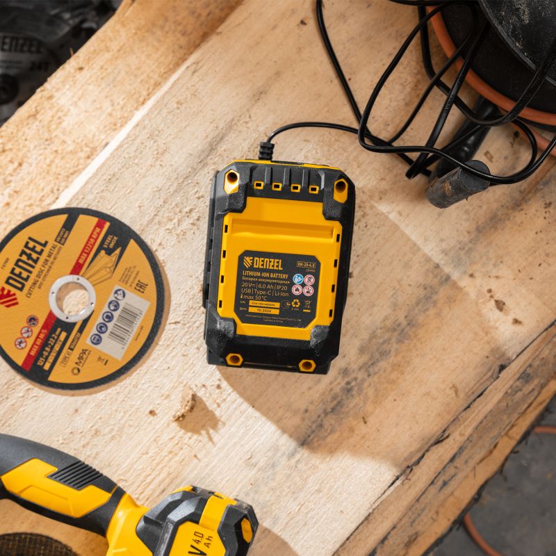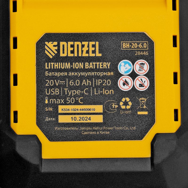 Батарея аккумуляторная Denzel BH-20-6.0, Li-Ion, USB, 20 В, 6,0 Ач, 28446