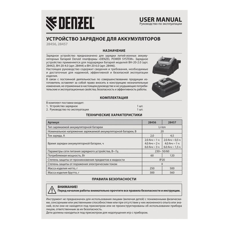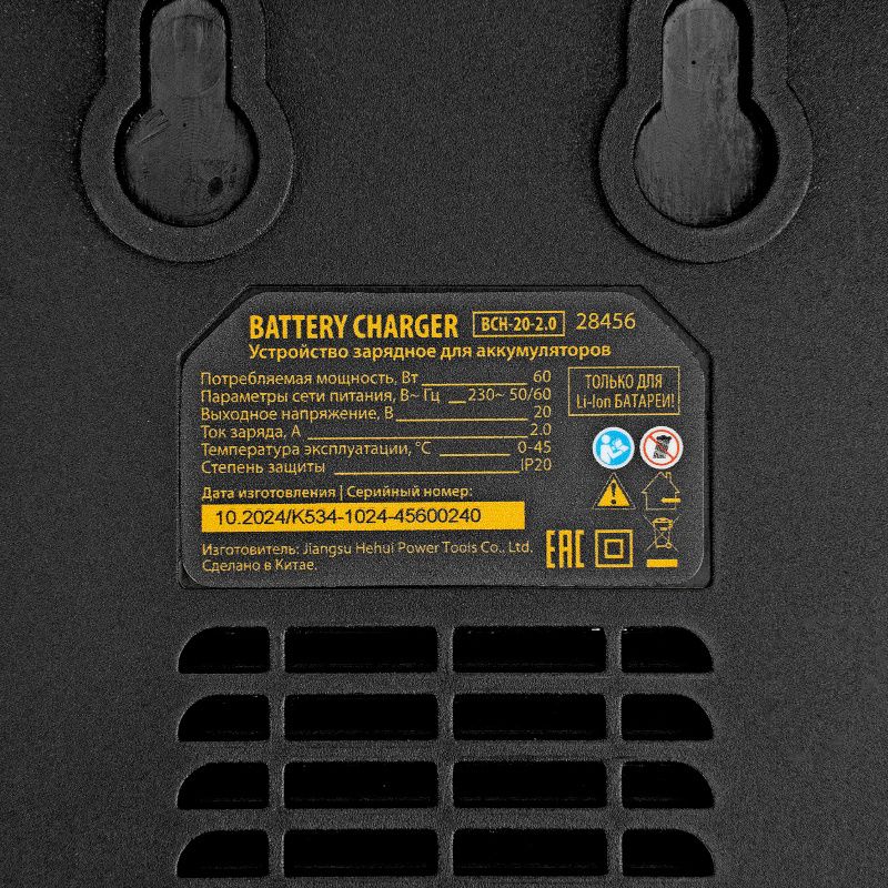 Устройство зарядное для аккумуляторов Denzel BCH-20-2.0, Li-Ion, 20 В, 2,0 А, 28456