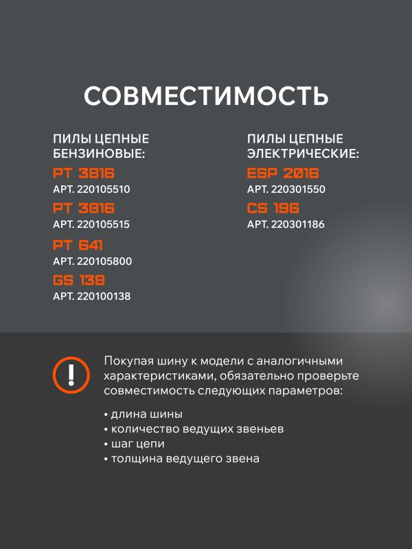 | Дополнительные характеристики | Легкая направляющая шина с тонким контуром обеспечивает отличную маневренность. Имеет эргономичную форму, снижает вероятность отскока и позволяет контролировать рабочий процесс. Изготовлена из специальной закаленной стали для увеличенного срока службы. |