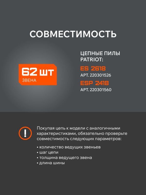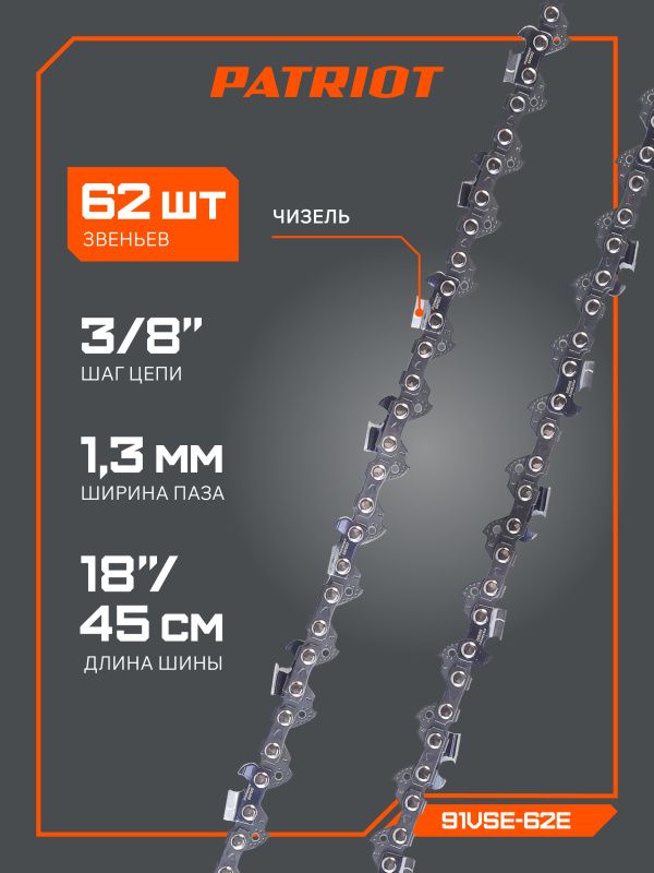 Цепь пильная PATRIOT 91VSE-62E (3/8quot;, 1,3 мм, 62 звена), 862351362